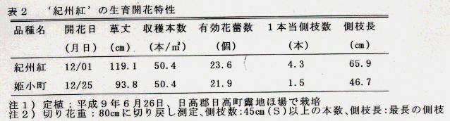 - 草丈は、119.1㎝と‘姫小町’に比べ25㎝程度長く、草姿が異なり1本当りの側枝数が多く、側枝長も長い(表2)。