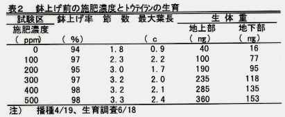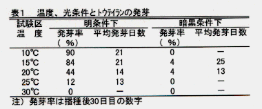 - 発芽適温は10~15℃で、発芽には光が必要である(表1)。