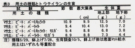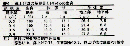 - 播種2か月後(本葉4枚程度)に9cmポットに鉢上げする。用土はマサ土、ピートモス、パーライトの等量配合とする(表3)。基肥には被覆複合肥料を用い、窒素として用土1リットル当たり0.5gを施用する(表4)。鉢上げ後は無加温で栽培する。