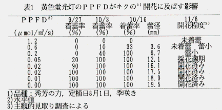 - キクではPPFDが0.05μmol(㎡/s当たり)以上で開花が遅延し、0.6μmolで開花遅延と未着蕾、1.2μmolですべてが未着蕾となる(表1)。