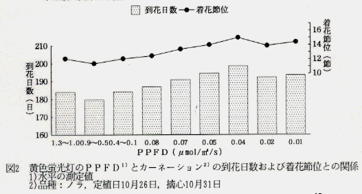 - 防蛾用黄色蛍光灯を栽培ほ場で終夜点灯すると、光強度により、キクでは開花遅延や未着蕾、カーネーションでは到花日数短縮、バラでは切り花長伸長が認められた。