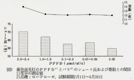 - バラでは萌芽基部から花頂部までのシュート長がPPFDが高いほど長くなる傾向が認められるが、0.1μmol以上ではやや開花が遅延する(図3)。