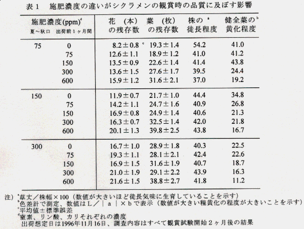 発表論文等 : 鉢花の品質維持に及ぼす栽培管理方法の影響 (第1報)シクラメンの品質維持に及ぼす施肥の影響、園芸学会雑誌、66巻別2、1997.