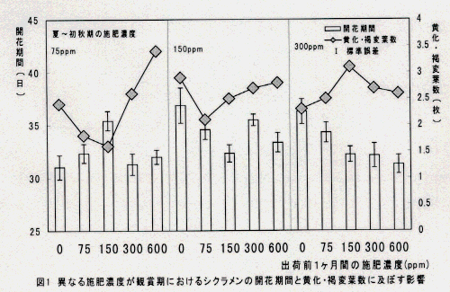 - 夏から秋口(8/16~10/15)の液肥を窒素、リン酸、カリとも75ppmの濃度で施用した場合、出荷前の1ケ月間(10/16~11/15)に施用する液肥の濃度を150ppmに上げることにより、一花当たりの開花期間の延長と黄化・褐変葉の発生の低減が見られ、日持ち性は良くなる(図1)。