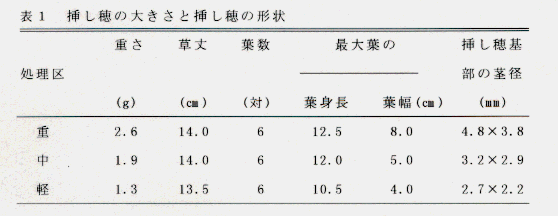 - 重い挿し穂は、軽い挿し穂に比べて最大葉の葉身長が長く葉幅が広い。また、基部の茎径が太い。しかし、草丈および葉数には差がない(表1)。