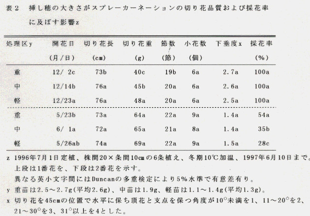 - 2番花の開花日は、重い苗が中苗より9日、同様に軽い苗より3日早い。一方、採花率は挿し穂が重いほど高くなり、重い苗が54%、中苗が35%、そして軽い苗が28%である(表2下段)。