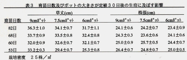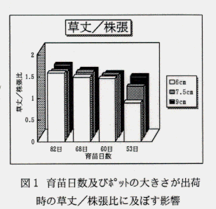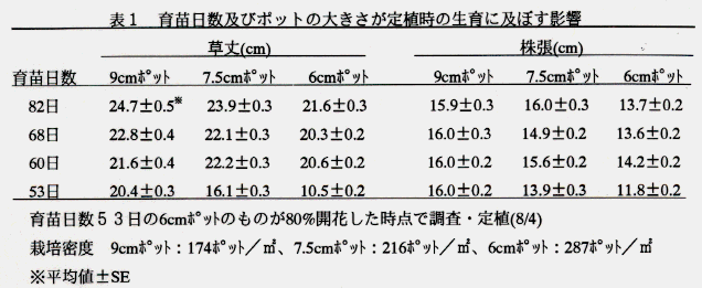 - そこで、播種期を変え、ポット上げ後の育苗日数の異なる苗を用い、小型化と育苗日数による影響を明らかにし、より小型容器化生産への資とする。