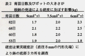 - 根鉢の発達を鉢底部の硬度でみると、ポットサイズが小さくなるほど根鉢が硬く、根の状態の悪い苗となっていた。また、9cm及び7.5cmポットでは育苗日数による差はなく、地上部との関連はみられなかったが、6cmポットでは育苗日数が長くなるにつれて硬度は高くなった(表2)。