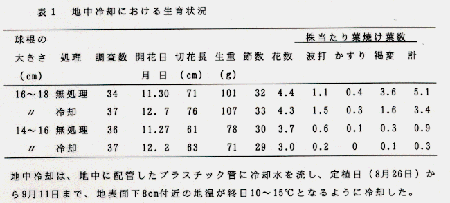 開花日は地中冷却により5~7日遅れるが、切花長は無処理区に対し2~5cm長い。生重、節数には差が無く、花数は地中冷却区で減少傾向がみられる(表1、2)。