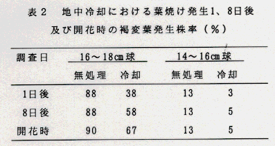 - 地中冷却の影響をみると、葉焼け症は、10~15℃の地中冷却区で発生率が低い。葉の褐変症状は、無処理区では発生から1日後で90%に達するが、地中冷却区ではその進行が遅く、1日後で38%、8日後で58%(最終発生率は67%)となる。