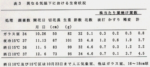 - オリエンタル系ユリ‘スターゲイザー’の輸入冷凍球を用いた年内出荷の作型において、葉焼け症状の多発による商品価値の低下が問題となっている。その発生原因については不明な点が多いが、発生原因の一つとして夏季の高温の影響が考えられる。そこで、気温の影響を調査するとともに、地温・気温冷却を行い、対策確立の資料を得る。
