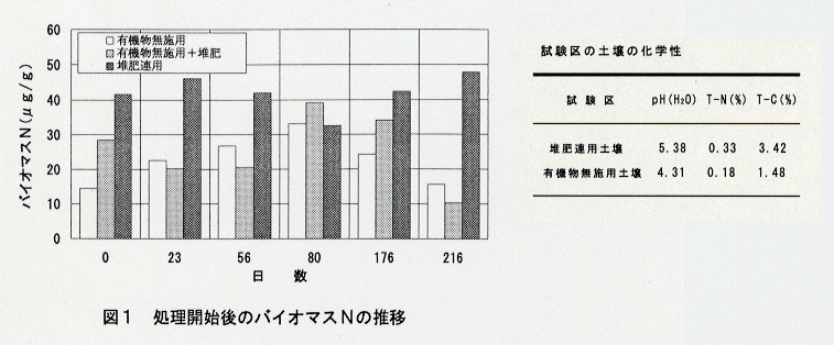 - 以上のように、堆肥の連用によってバイオマスが大きくなり、バイオマス窒素の代謝回転速度は、堆肥の連用を続けた場合が単年の施用に比べ1.3倍、無施用に比べ1.5倍速くなる。10a当り深さ10cmまでの土壌バイオマスから、年間に堆肥の連用を続けた土壌では3.6kg、堆肥の単年の施用土壌では1.7kg、有機物無施用土壌では1.3kgの窒素が供給される。