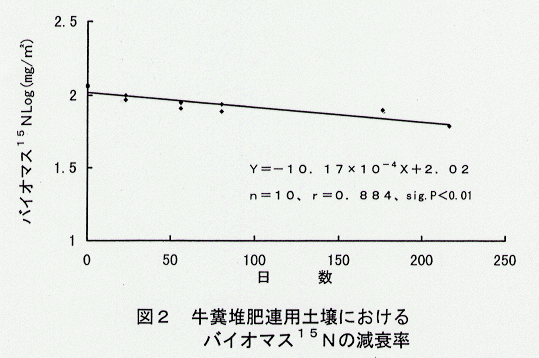 - 堆肥の連用を続けた場合、バイオマス窒素の半減期は296日で代謝回転速度は1.17年となる(図2)。