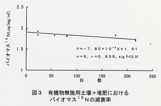 - 有機物無施用土壌に堆肥を施用した場合、バイオマス窒素の半減期は386日で代謝回転速度は1.53年となる(図3)。
