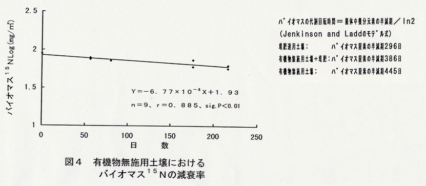 - 有機物無施用を続けた場合、バイオマス窒素の半減期は445日で代謝回転速度は1.76年となる(図4)。