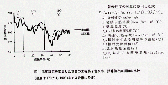 - 温度設定の変更による工程終了含水率の変化は、熱輻射が茶葉への伝熱の大部分を占める試算値と一致する部分が多く、乾燥室内の火炉や煙道など装置内の熱放射体温度から工程終了含水率を推定できる(図1)。