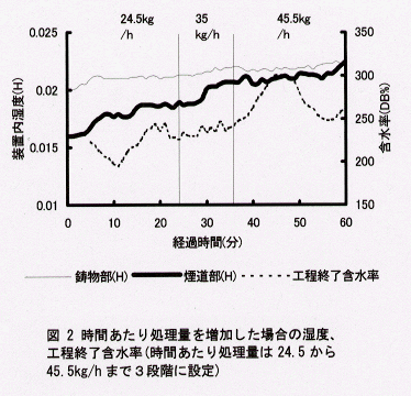 - 時間あたり処理量が多く乾燥不十分となる状態では、蒸散した水蒸気が装置内に停滞する影響が、装置内湿度の上昇、排気温度の低下、排気風速の減少として現れ、これら測定値の推移が円滑な乾燥条件を保つ指標となる(図2、3)。