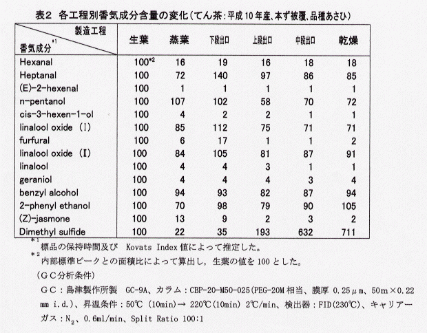 - てん茶製造の場合でも、玉露と同様に、hexanal,(E)-2-hexenal,cis-3-hexen-1-ol,furfural,linalool, geraniolは蒸し工程で大きく減少し、その後は大きな変化がないが、Dimethyl sulfideは、工程の進行に伴って増加し、特に中段、乾燥工程で急増する。その他の成分は、玉露製造の場合と異なり、大きな変化はみられない(表2)。
