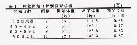 - 場内における120日間の親子放牧では、子牛の放牧開始日齢が50日齢以上だとその後の放牧期間中の発育は平均DGで0.80㎏以上と良好である(表1)。