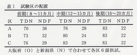 - 乳用種去勢牛の肥育前期、中期(8~15カ月齢)に、粕類を利用してTDNとNDFの水準を変え、枝肉成績、肉質に及ぼす影響を2地域において調査した(表1)。