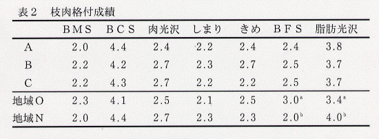 - 枝肉格付におけるBMS、BCS、肉の光沢、しまり、きめには試験処理及び地域間による有意な差はみられない(表2)。