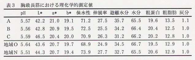 - 胸最長筋における水分、粗蛋白質、粗脂肪、灰分、pH、L*、a*、b*(表色系)に処理(栄養水準区、地域)による差はみられない(表3)。保水性では、加圧保水性では有意な差はみられないが、遊離水分率ではA>B>Cとなり、Cがわずかによい。