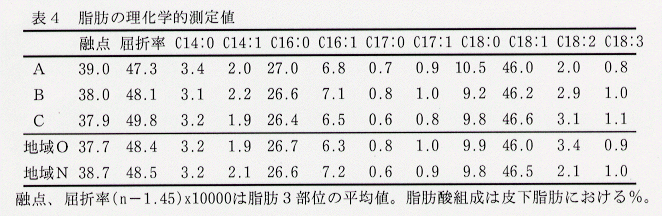 - 脂肪の品質では顕著な影響はみられないが、A区でやや融点が高く、屈折率が低い傾向にある(表4)。脂肪酸組成では処理による差はほとんどなく、全脂質、中性脂質にも大きな変化はみられない。