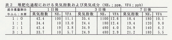 - 堆肥化過程の臭気は水草との混合により悪化することはない(表2)。