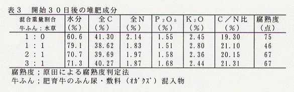- 開始30日後の腐熟度から、混合時の水分を70%にまで落とすように牛ふんと水草投入量を調整することにより堆肥化が可能である(表3)。