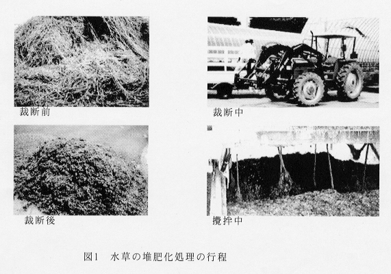 - 水草は牛ふんと混合して、水分を70%に調整すると、臭気が問題にならず堆肥化が可能である。水草をコーンハーベスタで裁断することにより、ロータリー式攪拌発酵施設が利用できる。