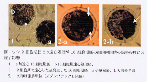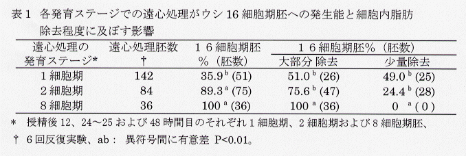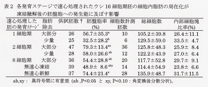 - 凍結融解した16細胞期胚の胚盤胞への発生率は、2細胞期胚での遠心処理により細胞内脂肪が大部分除去された場合に無遠心胚より高く、細胞数や細胞構成では無遠心新鮮胚とに有意な差はみられない(表2)。