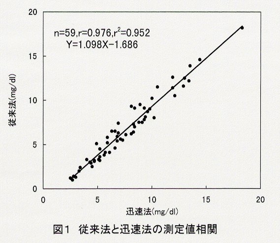 - 従来法と迅速法の測定値間には、相関係数0.976の有意な正の相関が認められ、その回帰式はy=1.098x+1.686であった(図1)。