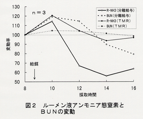 - 飼料摂取に伴うR-NH3NとBUNの変動パターンを完全混合給餌(TMR)と分離給与で比較した。R-NH3NとBUNは給餌後最初の採取時点で最高値に達した。その後、低下の変動率はR-NH3Nの方が大きかった。分離給与に比べ完全混合給餌(TMR)での変動率は小さかった(図2)。