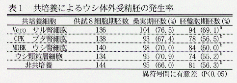- ウシ体外受精胚を、3種類の株化細胞及びウシ顆粒層細胞による共培養区と非共培養区において培養した結果、胚盤胞期胚への発生率はサル腎細胞由来株化細胞(Vero細胞)との共培養区が他区に比べて有意に高かった(表1)。