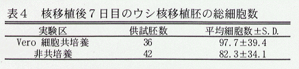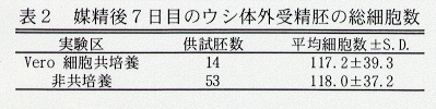 - 媒精後7日目のウシ体外受精胚の総細胞数は、Vero細胞との共培養区、非共培養区の間に差は認められなかった(表2)。