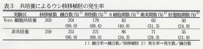 - 凍結した体外受精胚をドナーとしたウシ核移植胚を、Vero細胞と共培養して発生率について調査した結果、胚盤胞期胚への発生率は非共培養区より高い傾向にあった(表3)。