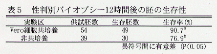 - 体外受精由来の胚盤胞期胚を性判別バイオプシー し、12時間後の胚の生存率はVero細胞との共培養区が有意に高かった(表5)。