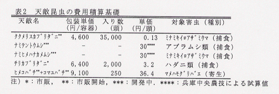 - 天敵利用体系では、10a当たり天敵代と農薬費として合計597.2千円、34.3時間の作業を必要とし、慣行防除体系の農薬費は4.5千円、散布作業8.7時間である。天敵利用体系への転換には592.7千円/10aの追加費用を必要とする(表1、2)。この費用は、ナスを23%高く販売するのに見合う金額である。