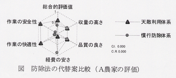 - 天敵利用体系は減農薬、作業の快適性、作業の安全性において高く評価される。品質・収量差はなく、生産現場における総合評価では、天敵利用体系の評価は高い(図)。