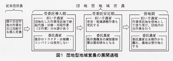 - 団地型地域営農(地域内の作業委託地を担い手ごとに団地化する営農形態)の展開過程は、委託内容の変化によって3つの段階に区分される(図1)。
