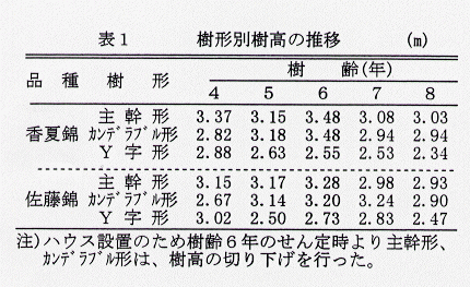 - 収量:樹齢が5、6年ではカンデラブル形の収量が最も多いが、以後はY字形が他の樹形と同程度以上となる(表2)。