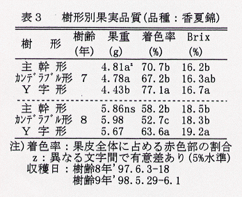 - 果実品質:着色率はいずれの品種ともY字形が最も優れ、また、Brixも他の樹形よりやや高い傾向である(表3)。