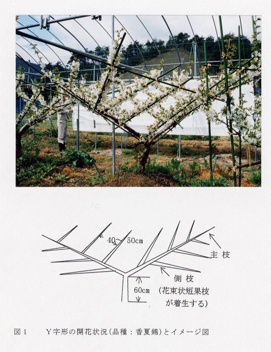 - 品種は「香夏錦」「佐藤錦」(コルト台)を供試し、栽植間隔は列間5m、株間3mである。樹形はカンデラブル形、Y字形(図1)、主幹形について比較検討した。