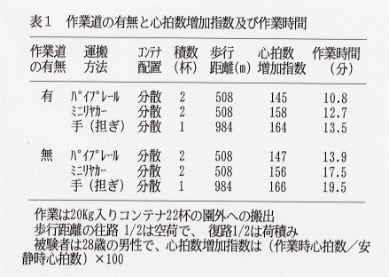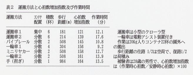 - 作業道が設置されている園では、コンテナを一カ所にまとめて置き、運搬車を用いて搬出する方法で作業負担が最も少ない(表2)。