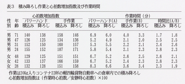 - パワーハンドを利用したコンテナの積み降ろし作業は、手作業に比べて、心拍数の増加割合が小さく、作業負担が軽くなる。この場合、男性の高齢者及び女性で作業負担軽減効果が大きい。ただし、作業時間は手作業の 2~2.5倍要する(表3)。