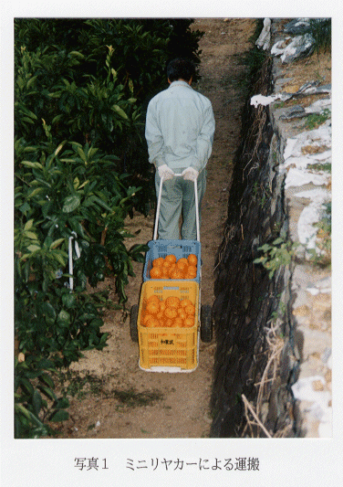 - 急傾斜地ウンシュウミカン園では収穫果実の上下方向の運搬にはモノラックを用いているが、横方向は人力による抱え運搬に頼る場合が多い。収穫から出荷までの間に、コンテナの抱え運搬と積み降ろし作業は 5~ 7回にも及んでいる。
