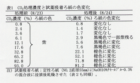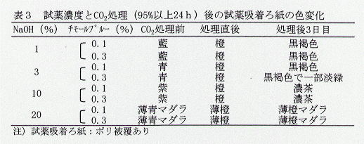 - CO2 検知紙は、ろ紙にNaOH10%とチモールブルー0.1~0.3%の混合液に吸着後乾燥させ、厚さ0.03mmのポリ袋で密封したものが、処理前と変色後の色の差が明瞭である(表3)。