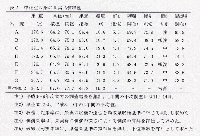 - 中晩生系西条は早生系統に比べて一般に果実の側溝が浅いが、系統Gは側溝を有するグループに属し、深さは中程度であり、早生優良系統の果形に似ている(表2)。
