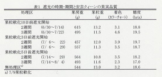 - ブドウ「安芸クィーン」は赤色大粒系ブドウとして期待されている。しかし、岡山県南部の果実生育期に高温である地区での簡易被覆栽培や無核栽培では着色不良となり、普及上の隘路となっている。そこで、果房の遮光あるいは反射マルチによって光条件を変え、着色向上の可能性を検討する。