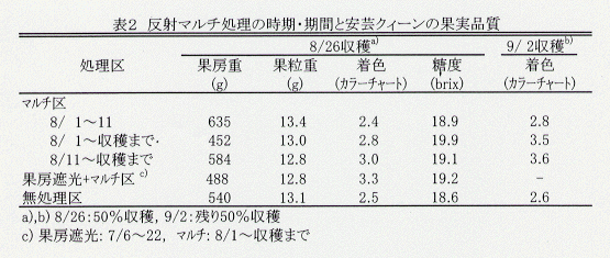- 収穫前2~3週間処理によって、果粒重は変わらず、着色が促進され、果房の遮光と反射マルチを併用処理すると、マルチ単独処理よりやや着色良好であった(表2)。